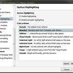 모노디벨롭 상단 바에 Tools -> Options클릭 하단에 보이는 Text Editor -> Syntax Highlighting 클릭 상단에 보이시는 이미지와 같은 원하시는 테마 선택후 OK버튼 눌러주시면 됩니다 Monokai 및 여러 테마를 적용 시키고 싶을떈https://github.com/dkucinskas/MonoDevelop-Styles/archive/master.zip 다운받으신후 위에보이시는 Edit를 클릭후 원하시는테마 넣어주신후! OK버튼만 눌러주시면 끝. 그럼 위에와 같은 코드가 적용 됨니다.